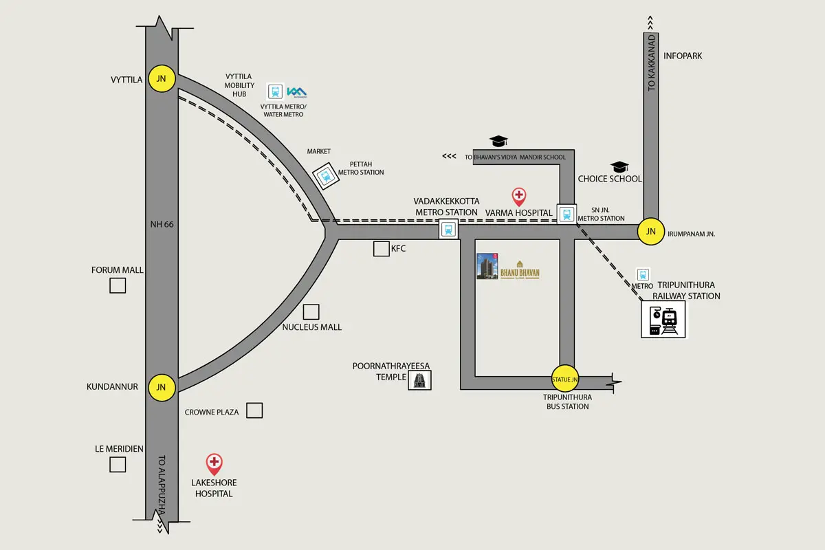 Bhanu Bhavan, Varma Homes' new residential project in the Temple Town of Tripunithura offers premium 3 BHK apartments that give your lives a traditional touch in the city. Situated at Vadakkekotta junction, where you experience the accessibilities and conveniences of the city, in a serene and heritage rich ambience, these premium apartments offer you an experience that converges both modern city and serenity into one. At Bhanu Bhavan, life is really a class apart. Equipped with the latest amenities and world-class facilities, these apartments are meant to give you the true taste of prestigious living. Access to healthcare and educational institutions remains a top priority for new home buyers especially for families with kids and the elderly. At Bhanu Bhavan, your healthcare concerns are taken care of. Reputed hospitals and other medical centres with state-of-the-art facilities and experienced professionals are just a stone's throw away. Varma Hospital, Devi Hospital, Medical Trust, VKM Hospital, etc are renowned hospitals located near Bhanu Bhavan. Also you have best educational institutions like Bhavans Vidya Mandir, Chinmaya Vidyala and Choice School at a short reach. With the newly-inaugurated Forum Mall at a very close distance which offers a grand opportunity for celebrating your special days hanging out with your loved ones, Bhanu Bhavan gives you the ease of having connected, convenient and cheerful lives.