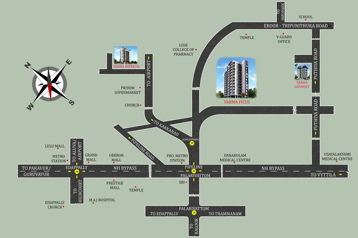 Varma Homes brings to you a home that is designed to fulfill your every wish. In the heart of the happening city of Kochi, at the prime locality of Alinchuvadu, surrounded by options for shopping, dining, and entertainment Varma Ficus stands tall. At close proximity to the project are one of the liveliest IT campuses. The project also shares the neighbourhood with eminent educational institutions, hospitals, supermarkets, and other wellness and recreation centers. With easy connectivity to NH Bypass, transportation for school, work, and other daily activities will never be a problem here. Experience the joy of togetherness in our smartly designed 2 BHK and 3 BHK apartments. Share good health habits with your loved ones with our state-of-the-art health club. Dive into our lavish swimming pool, sweat your worries out in our multi-sport courts. Celebrate precious moments with your family members at our rooftop party area. Life at Varma Ficus is all about happier relationships and healthier lifestyles.